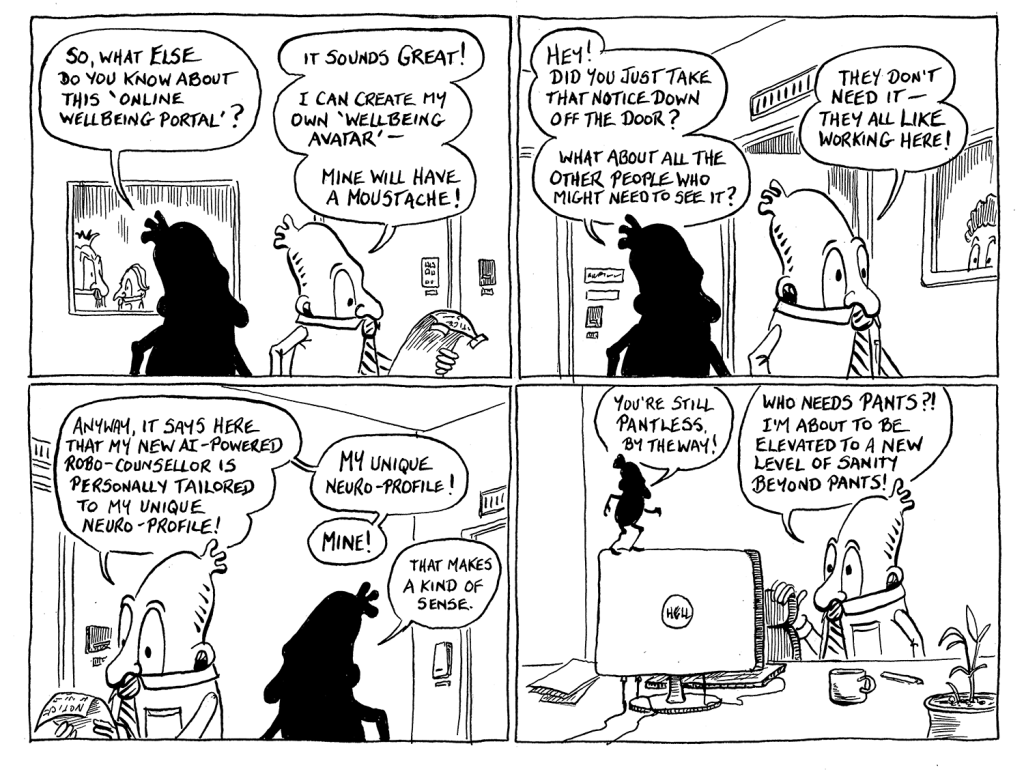 Here we pick up the main narrative thread again. Last time, our protagonist had discovered that the human counsellor he was waiting to see has been replaced by a digital…something. He doesn’t quite know how it’s all going to work, but his mood has improved. And he seems to have left his trousers behind somewhere.